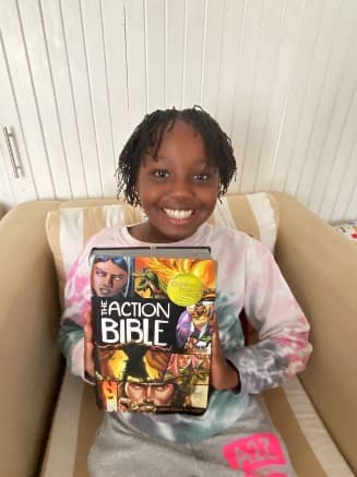 Zudi loves the colorful, captivating images in her copy of The Action Bible.